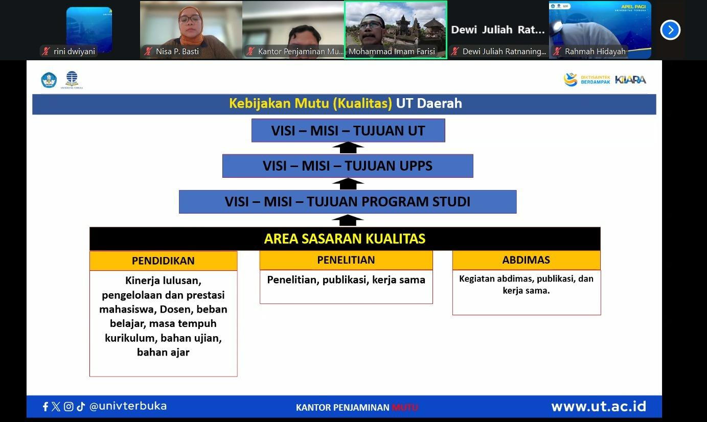 Tangerang Selatan – Kantor Penjaminan Mutu (KPM) Universitas Terbuka kembali memperkuat komitmennya dalam menjaga kualitas standar pendidikan dengan menyelenggarakan kegiatan Sosialisasi Pelaksanaan dan Aplikasi Sasaran Mutu (SARMUT) Akademik. Acara ini dilaksanakan secara daring melalui platform Zoom Meeting pada Selasa, 16 Desember 2025.